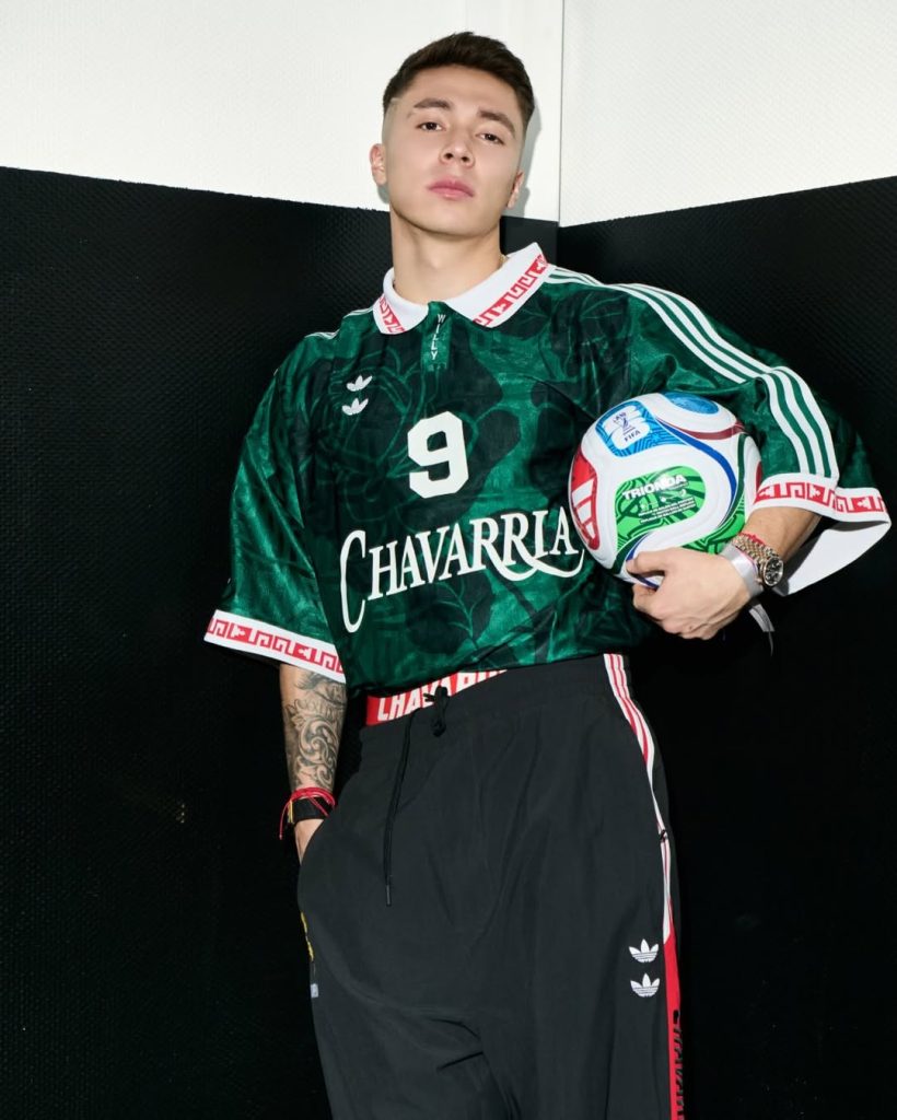Plutôt qu’une simple relecture du maillot mexicain de 1986, Chavarria développe un vestiaire global : crampons repensés, shorts baggy ornés du drapeau mexicain, ballon porté sous le bras comme un accessoire de style. La présence de Marcelo sur le podium parachève cet hommage à la culture footballistique, traitée comme un langage esthétique et politique.