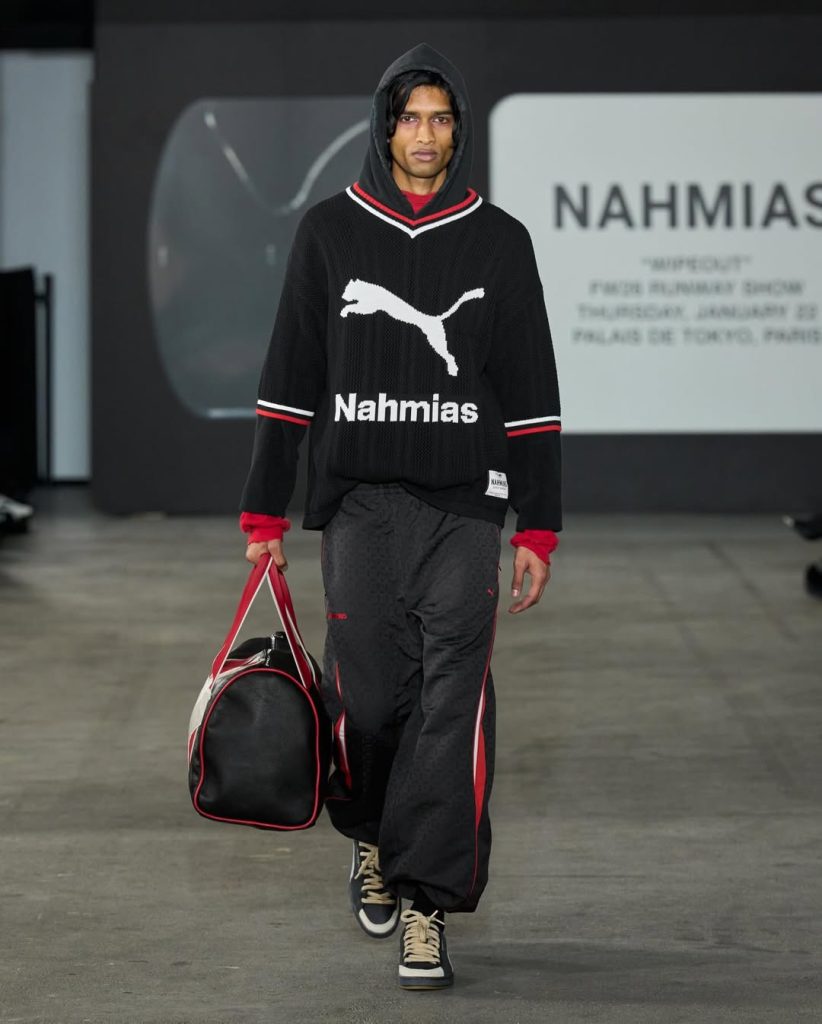 Alors que Puma multiplie les prises de parole — événements, rééditions et lancement de silhouettes à plateforme — la marque allemande s’associe au label californien Nahmias. Aperçue sur le podium parisien, cette collaboration intervient à un moment stratégique, alors que le phénomène Marty Supreme, popularisé par Timothée Chalamet, continue de gagner en visibilité. Une alliance pensée comme un levier de rayonnement culturel.