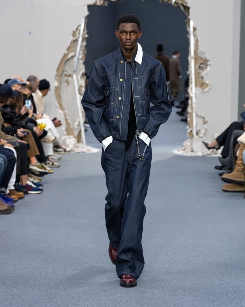 Après un hommage appuyé à James Dean la saison précédente, Sacai et Levi’s prolongent leur dialogue autour du denim. Cette saison, les blousons en jean surgissent sous des costumes, jouant sur l’effet de surprise et la superposition, signatures du label japonais.