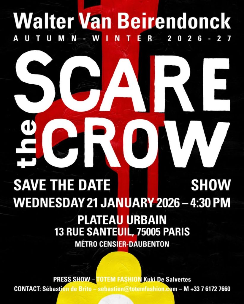 Figure incontournable de la scène belge, Walter Van Beirendonck a déjà annoncé la couleur. Sa collection Scare the Crow (« Effraie le corbeau ») sera présentée dans un lieu dont la date, l’heure et même la station de métro ont été rendues publiques — un geste rare dans l’univers très codifié des défilés parisiens.