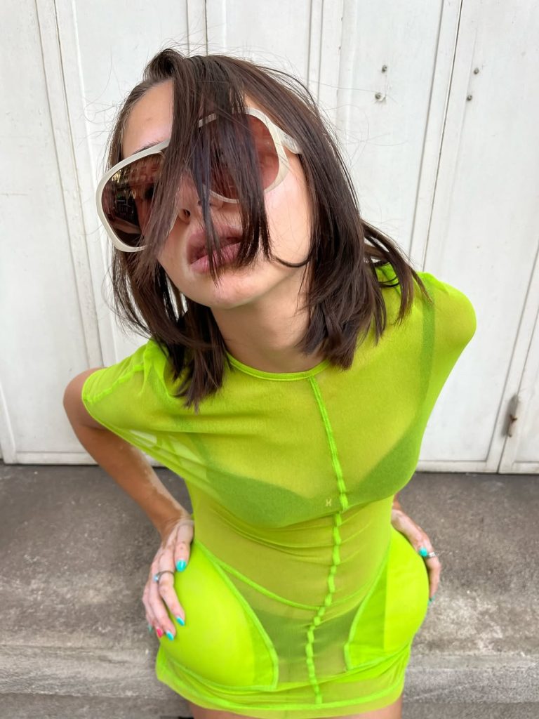 C’est dans cette filiation que s’inscrit aujourd’hui l’attitude dite « cunti cunta », expression popularisée par Loeva, cofondatrice des JUDE Party. Une esthétique qui s’oppose frontalement à la clean girl. Ici, tout est assumé : robe asymétrique jaune acide, mini-short fluo, maillot de bain façon Stabilo, bijoux XXL aux accents eighties. Le néon n’est plus un détail mais un manifeste, un jeu conscient avec le kitsch et l’exagération pour affirmer une identité visuelle forte.