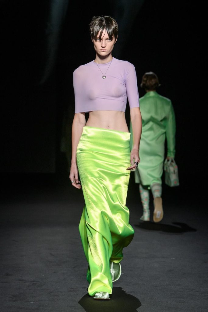 Autre option plus discrète : la manucure. Jaune électrique, rose néon ou motifs graphiques permettent d’introduire l’esthétique sans bouleverser l’ensemble du look. Enfin, pour les plus audacieux, la pièce forte reste la meilleure affirmation : jupe drapée orange radioactive, top seconde peau vert acide ou parka en nylon bleu électrique, dans un esprit qui rappelle l’ère Demna chez Balenciaga.