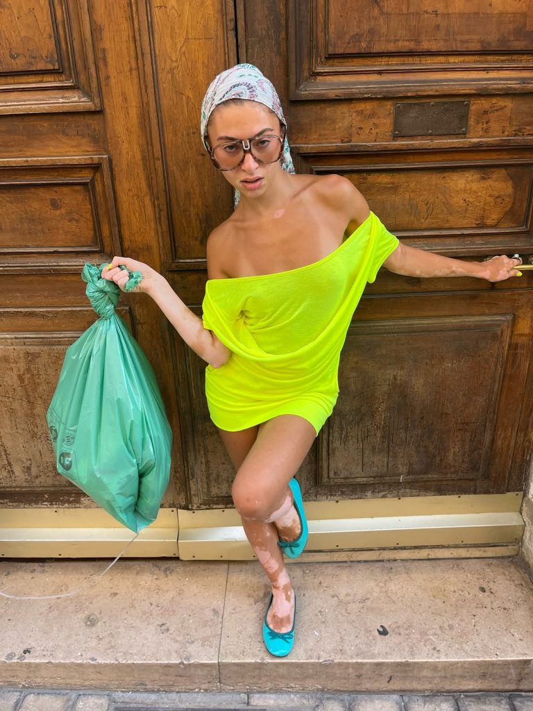 C’est dans cette filiation que s’inscrit aujourd’hui l’attitude dite « cunti cunta », expression popularisée par Loeva, cofondatrice des JUDE Party. Une esthétique qui s’oppose frontalement à la clean girl. Ici, tout est assumé : robe asymétrique jaune acide, mini-short fluo, maillot de bain façon Stabilo, bijoux XXL aux accents eighties. Le néon n’est plus un détail mais un manifeste, un jeu conscient avec le kitsch et l’exagération pour affirmer une identité visuelle forte.