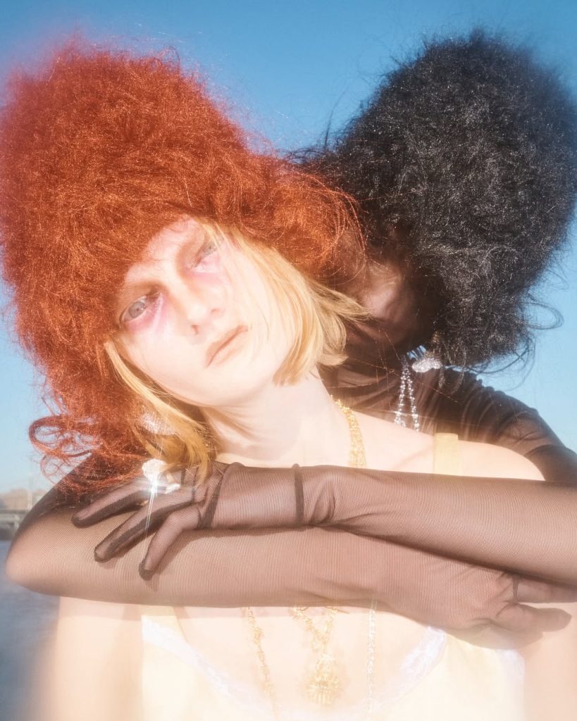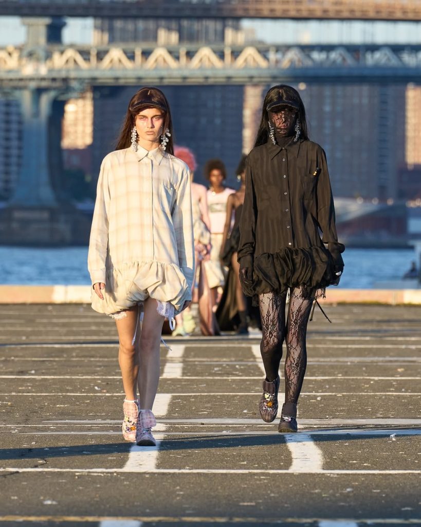 Collina Strada propose une mise en scène forte : chaque mannequin est suivi de son double, vêtu en noir, comme une ombre. Un dispositif qui transforme une robe de mariée en robe de deuil selon la couleur, soulignant la manière dont le contexte influe sur la lecture d’un vêtement.