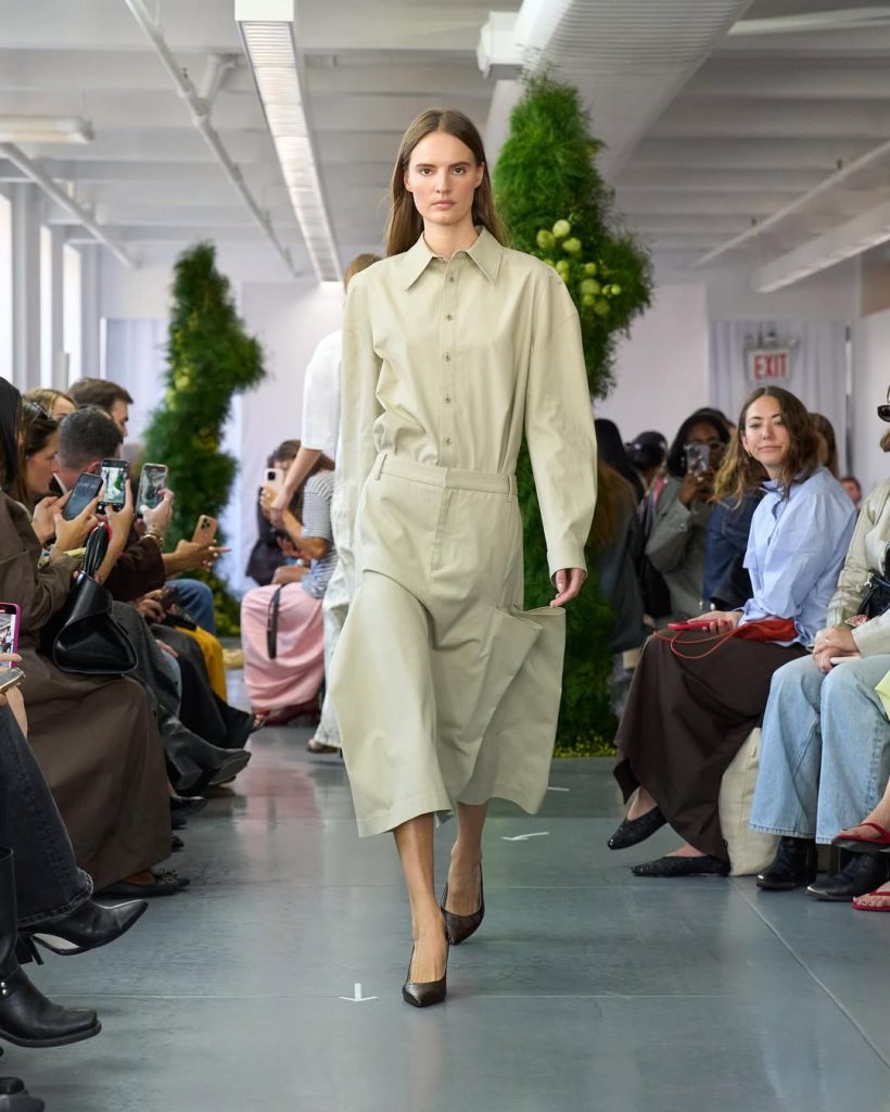 La sensualité n’est plus le seul langage de la féminité. Chez Tory Burch, les jupes s’arrêtent sous le genou, les lignes sont nettes, et les couleurs franches (rouge, jaune, bleu) injectent une vitalité contenue. Chez Khaite, Catherine Holstein cultive une tension mesurée : textures riches, coupes précises, silhouettes émergeant de la brume. De son côté, Tibi (Amy Smilovic) s’inspire du brutaliste architectural pour explorer les contrastes, entre rigueur et fluidité.