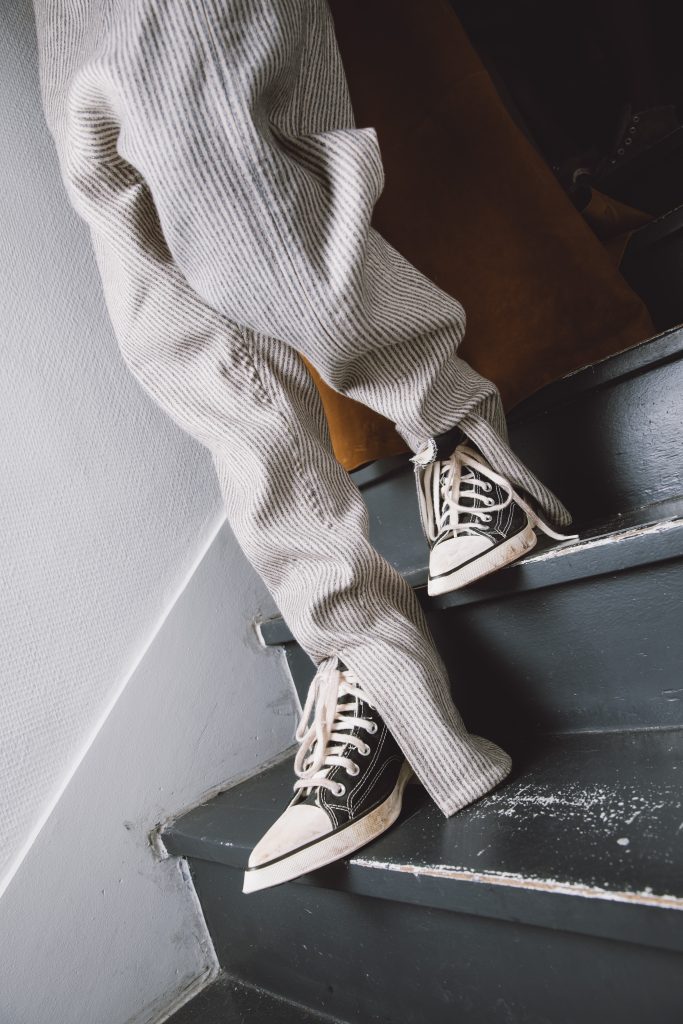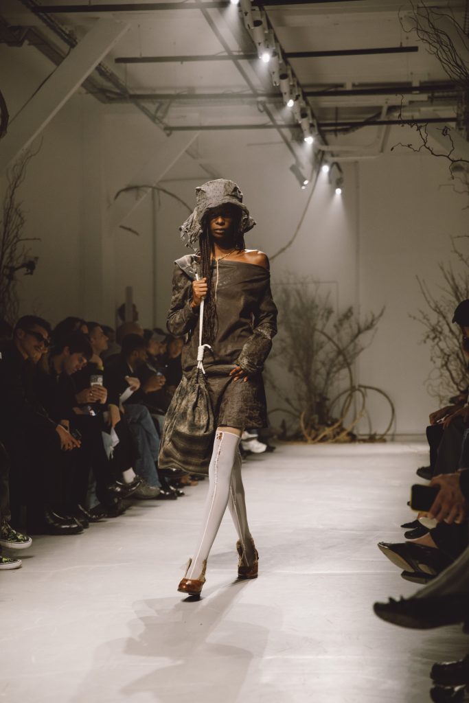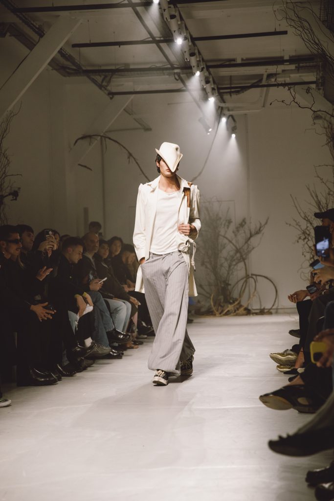 Pour ce défilé, il a choisi la forêt comme point de départ. Un espace ambigu, entre refuge et menace, où l’identité peut s’exprimer librement, loin des conventions sociales. Dans ce décor ultra-symbolique, les sneakers racontent cette ambiguïté. Le créateur revisite ainsi la silhouette iconique de la Chuck Taylor All Star en lui appliquant des textures inattendues et des finitions singulières. Les matières cirées, les traitements imperméables et les références utilitaires dialoguent avec l’esthétique outdoor de la collection. Un détournement subtil qui montre comment un classique peut s’inscrire dans un vocabulaire mode plus conceptuel.