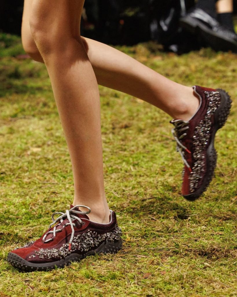 À l’époque, cette semelle futuriste marquait un tournant. Présentée à l’aube du nouveau millénaire, dans un contexte marqué par les fantasmes technologiques et le fameux bug de l’an 2000, elle symbolisait une nouvelle manière de penser la chaussure. Sport, mode et expérimentation se mélangeaient alors dans des silhouettes hybrides. Plus de vingt-cinq ans plus tard, cette semelle fait son retour sous plusieurs formes : sneakers, mules ou encore bottes. La nouvelle ligne navigue entre esthétique gorp-core et esprit volontairement quirky, avec des modèles qui évoquent parfois la silhouette de la Prada America’s Cup. Sur les côtés, de délicats détails de pierreries viennent toutefois féminiser la chaussure, créant un contraste inattendu.