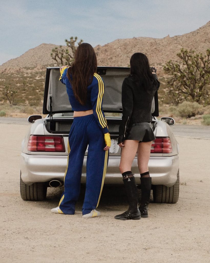 Sur l’asphalte brûlant d’une route désertique californienne, Gabriette et Devon Lee Carlson incarnent la collaboration Adidas x Miaou devant l’objectif.