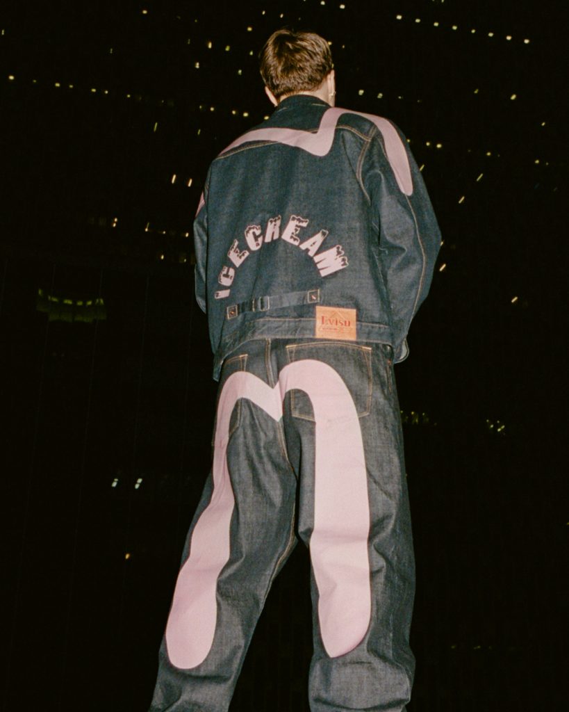 Les logos iconiques fusionnent — la mouette Evisu et le Running Dog d’Icecream — pour créer un emblème hybride immédiatement reconnaissable.